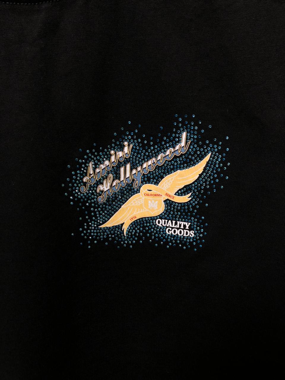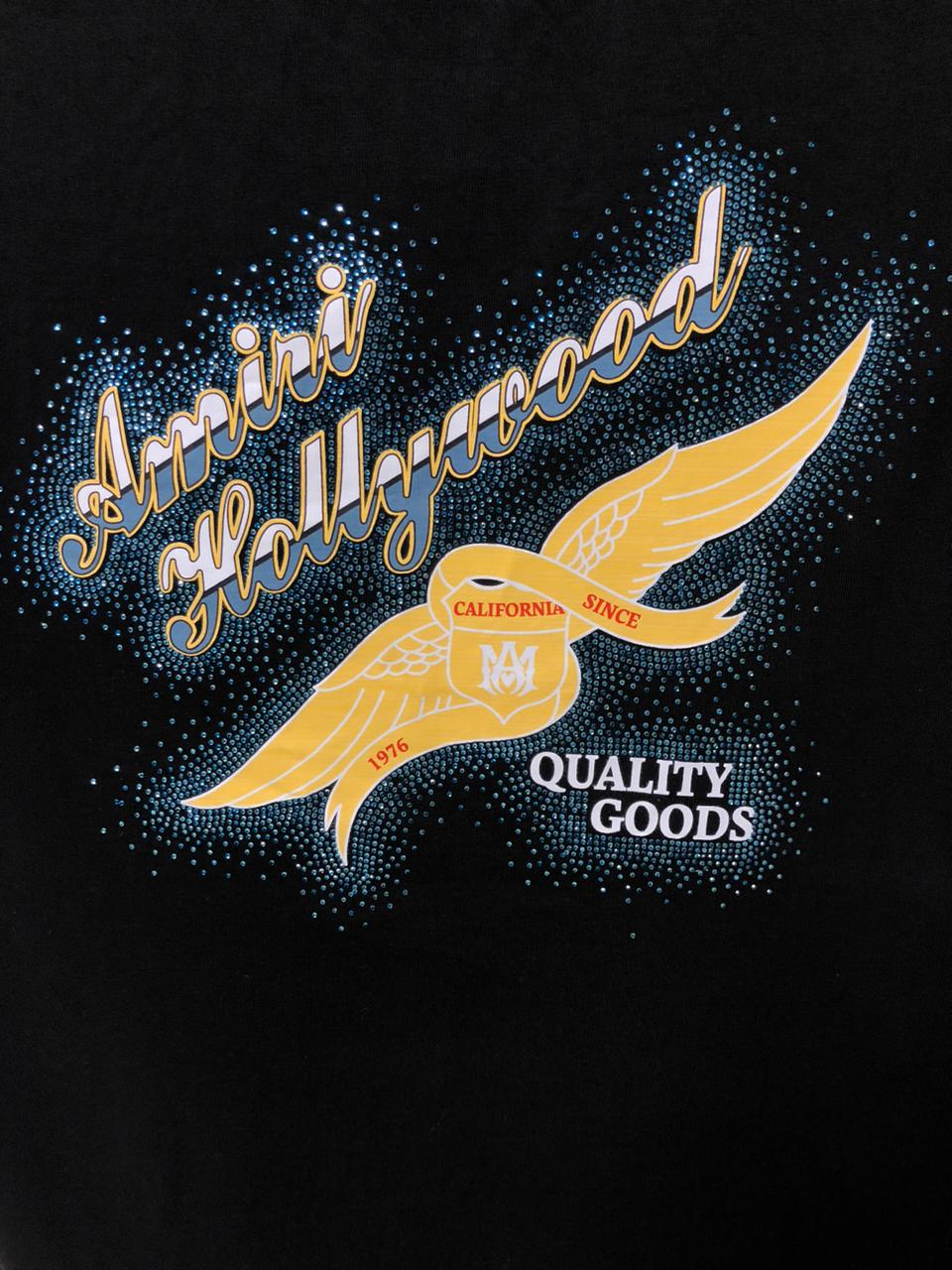 Back Detail: Large-scale “Amiri Hollywood Quality Goods” crystal wing graphic.
