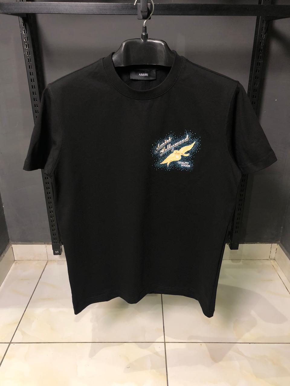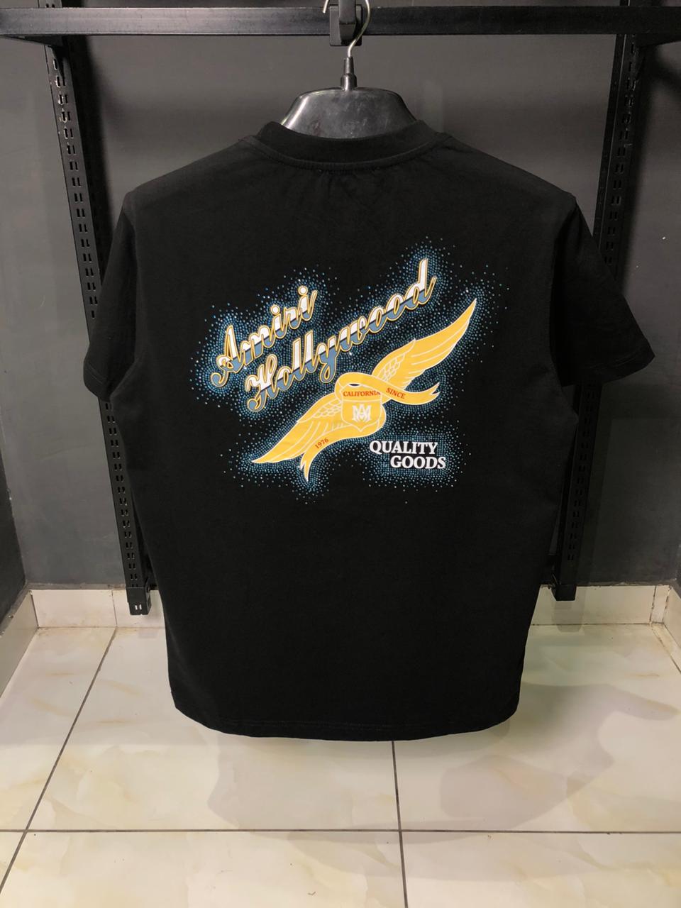 Front Detail: Small “Amiri Hollywood” crystal wing graphic on the left chest.