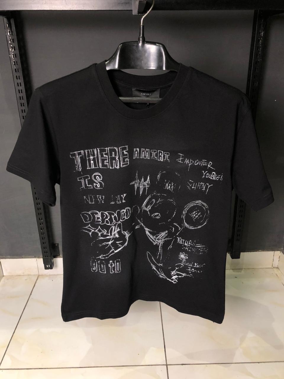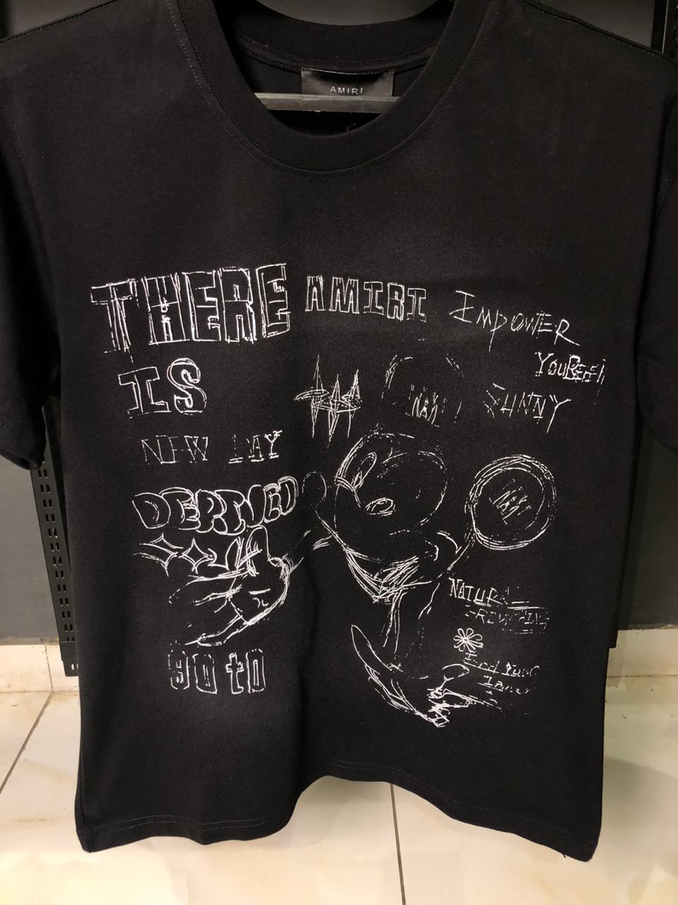 Redefine your urban aesthetic with the Amiri Black Sketch Graphic T-Shirt. This piece perfectly captures Mike Amiri’s signature blend of high-fashion craftsmanship and raw, L.A. street culture. The deep black canvas features intricate, chalk-style hand-drawn graphics, including the motivational “There Is A New Day” and “Empower Yourself” slogans.