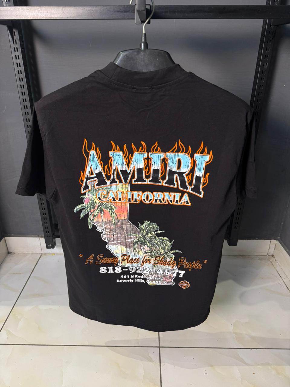 Capture the high-octane spirit of Los Angeles luxury. This AMIRI California T-Shirt features the brand’s iconic “A Sunny Place for Shady People” slogan, a bold nod to the gritty glamour of Hollywood. The garment is defined by vibrant flame-engulfed “AMIRI” branding on both the front chest and back, accompanied by a retro-inspired California sunset graphic.