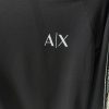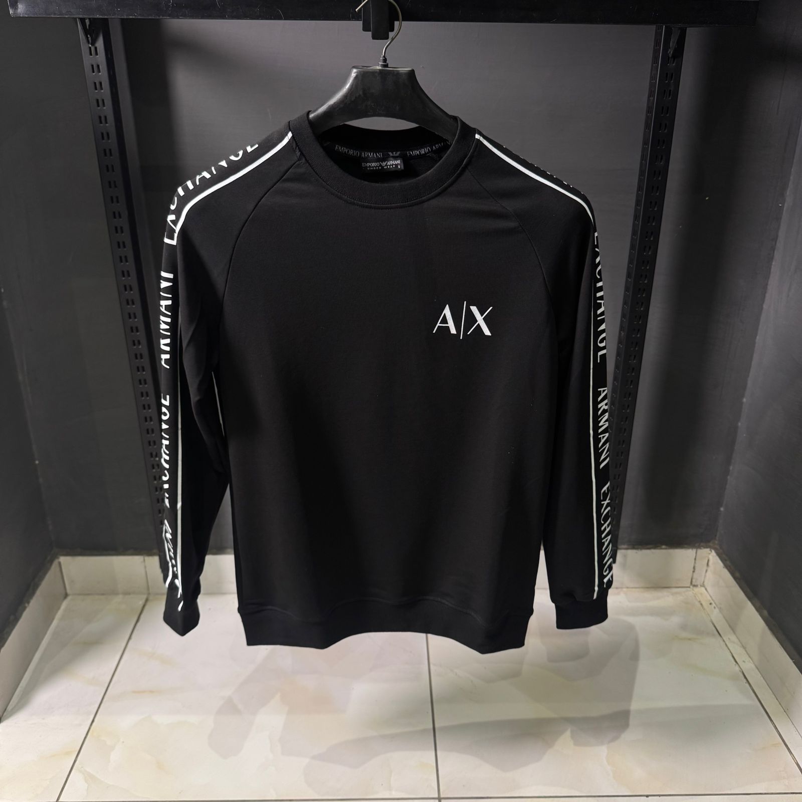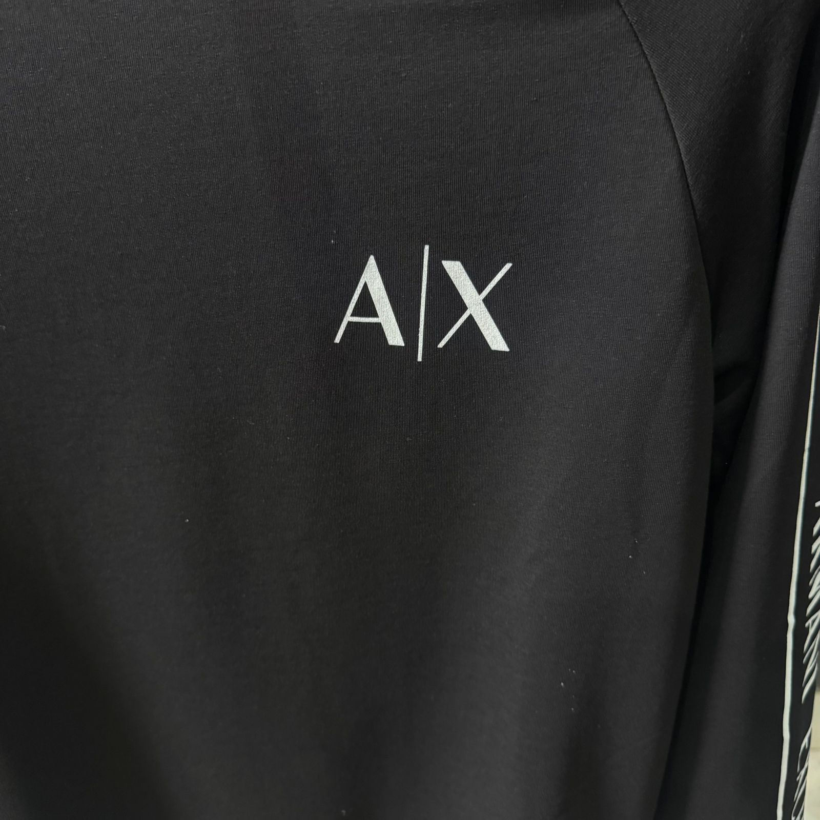 This is a sporty and modern sweatshirt from Armani Exchange (A|X). The black crewneck is streamlined and features the iconic A|X logo printed in white on the chest. The distinguishing feature is the white logo tape that runs along the raglan sleeve seams, repeating the “ARMANI EXCHANGE” lettering for a prominent, athletic-inspired statement. Made from a comfortable cotton blend, this piece is designed for a regular fit and is perfect for casual, everyday streetwear.
