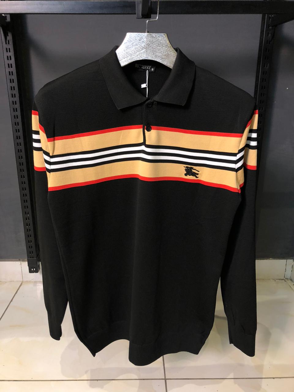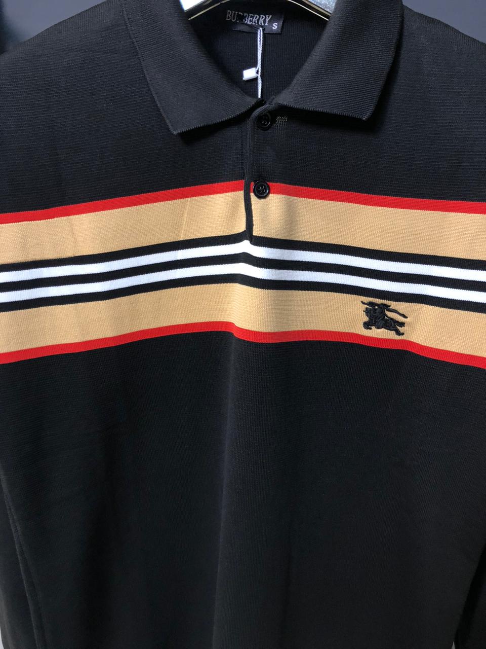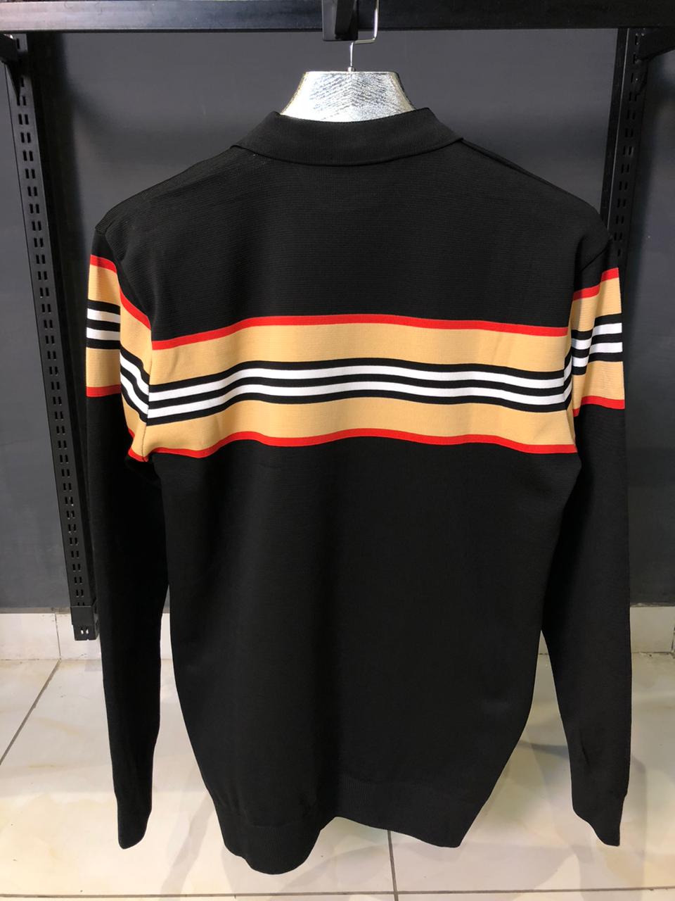 Redefine your luxury collection with this Burberry Long-Sleeve Polo in timeless black. This standout piece features the signature Icon Stripe—a bold horizontal graphic of red, white, and honey-beige—running across the chest and sleeves.