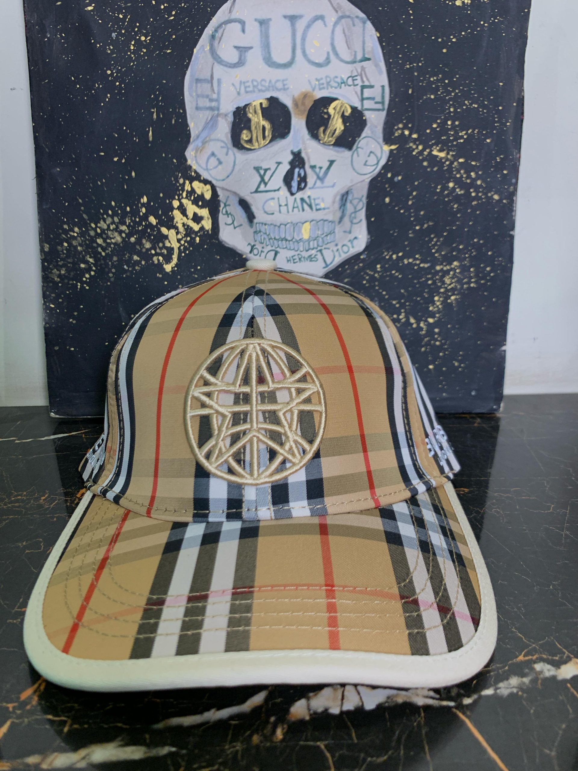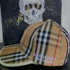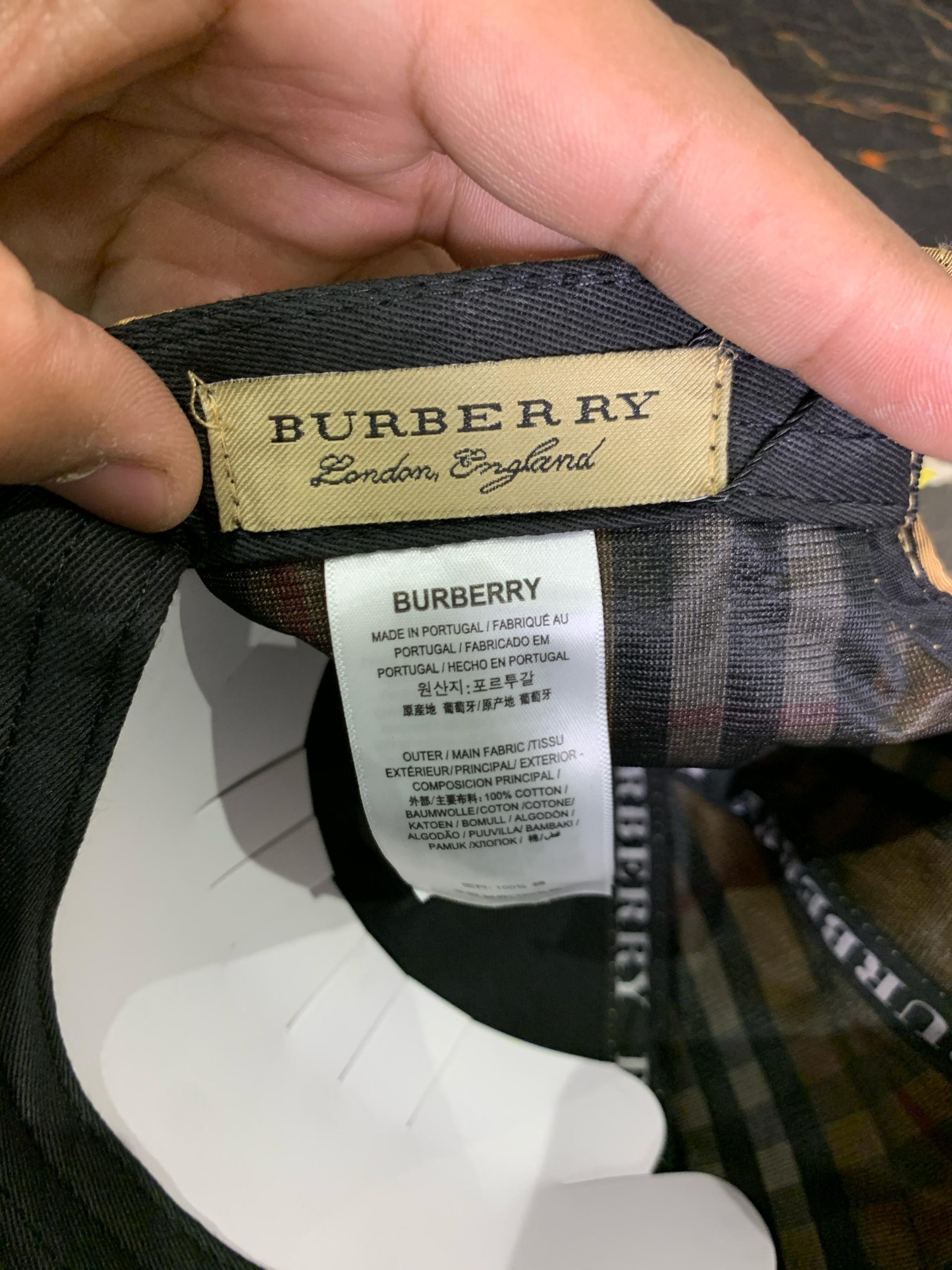 Burberry ki classic check pattern wali cap hai, adjustable clip closure ke saath. Back side pe Burberry ka embroidered logo hota hai.