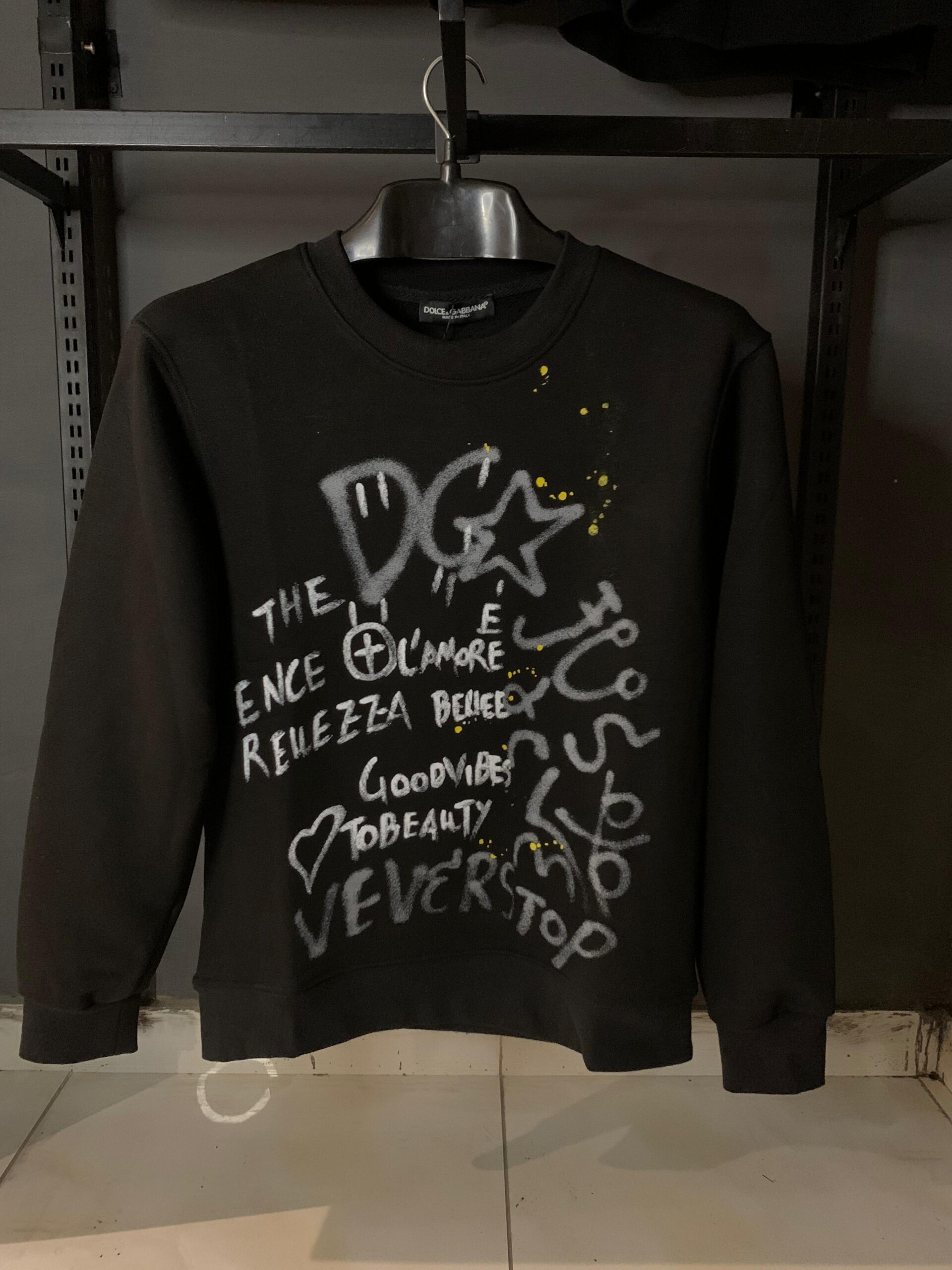 This D&G black sweatshirt showcases striking graffiti-style lettering, blending street art with luxury fashion. Its bold design and comfortable fit make it a standout piece for adding an edgy touch to any casual outfit.