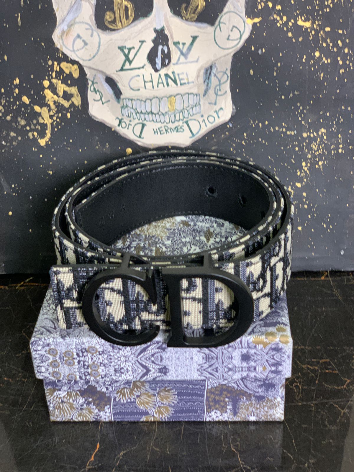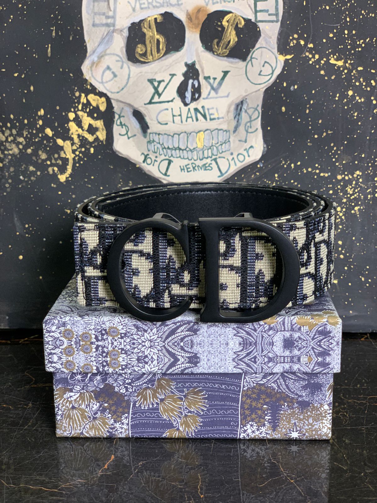 A bold blend of heritage and modern luxury, this piece features Dior’s iconic navy blue Oblique canvas paired with a sleek black CD logo buckle. Sophisticated, stylish, and unmistakably Dior — perfect for elevating any look.