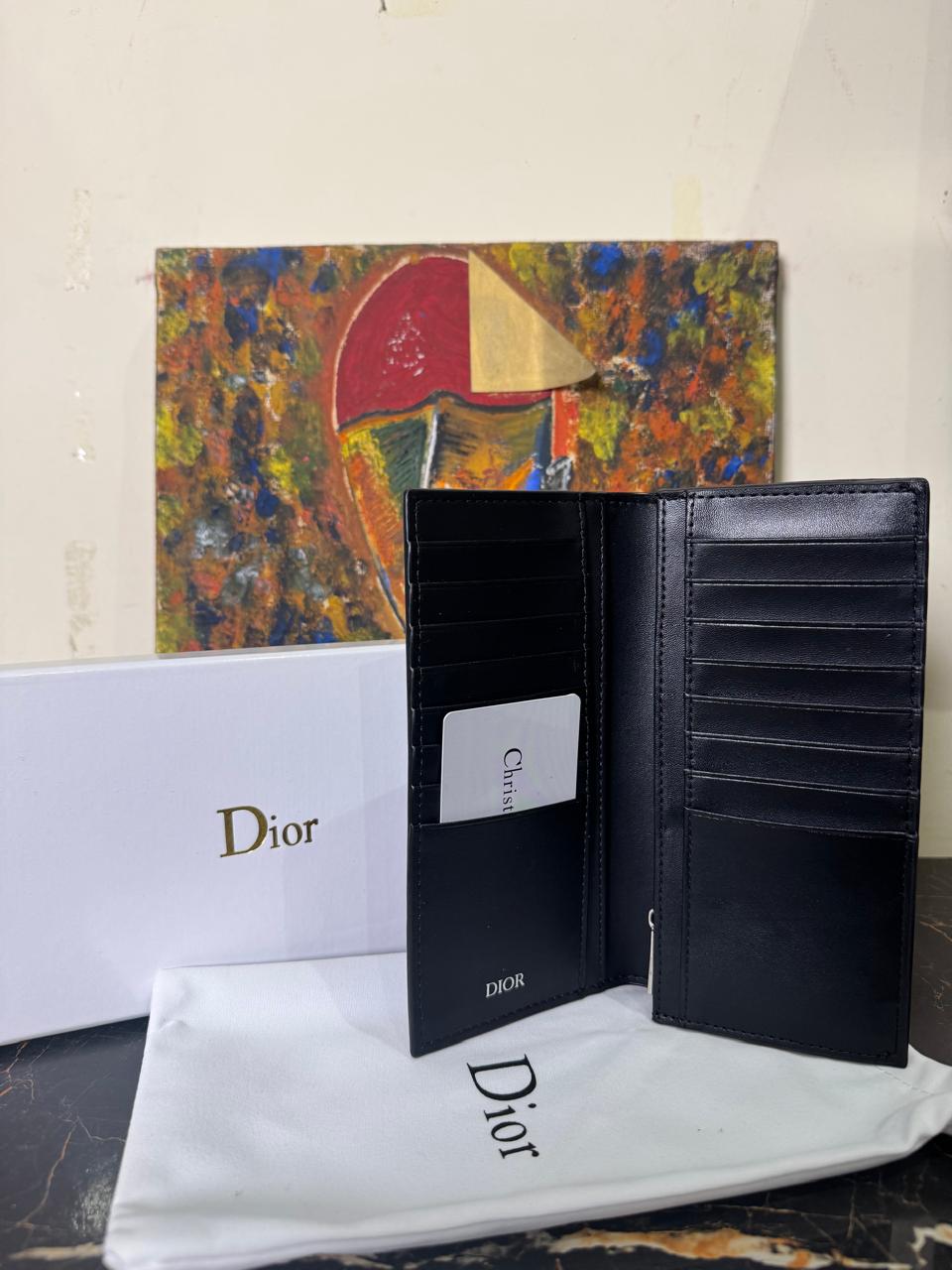 The interior is lined with premium smooth calfskin and is meticulously organized with 16 card slots, four bill compartments, and a zipped coin pocket. Finished with a subtle ruthenium-finish brass Dior signature on the front, this wallet is a masterclass in functional luxury and timeless French craftsmanship.