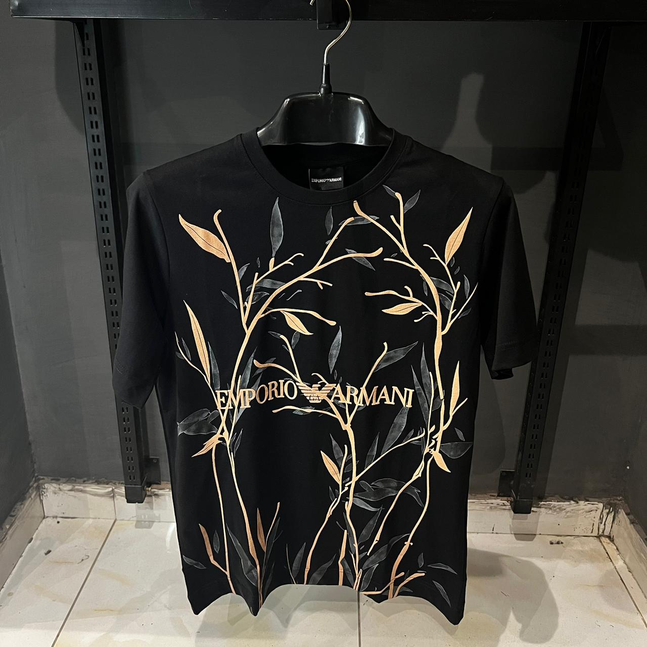 Crew-neck T-shirt made from pure cotton jersey embellished with an exclusive nature-inspired print : stylised flowers like ginkgo or bamboo ramage of such fine crafting that it resembles a pen and ink drawing. The palette centres around shades of sand, butter and beige, interrupted by hints of black, immediately evoking the freshness of the upcoming summer.