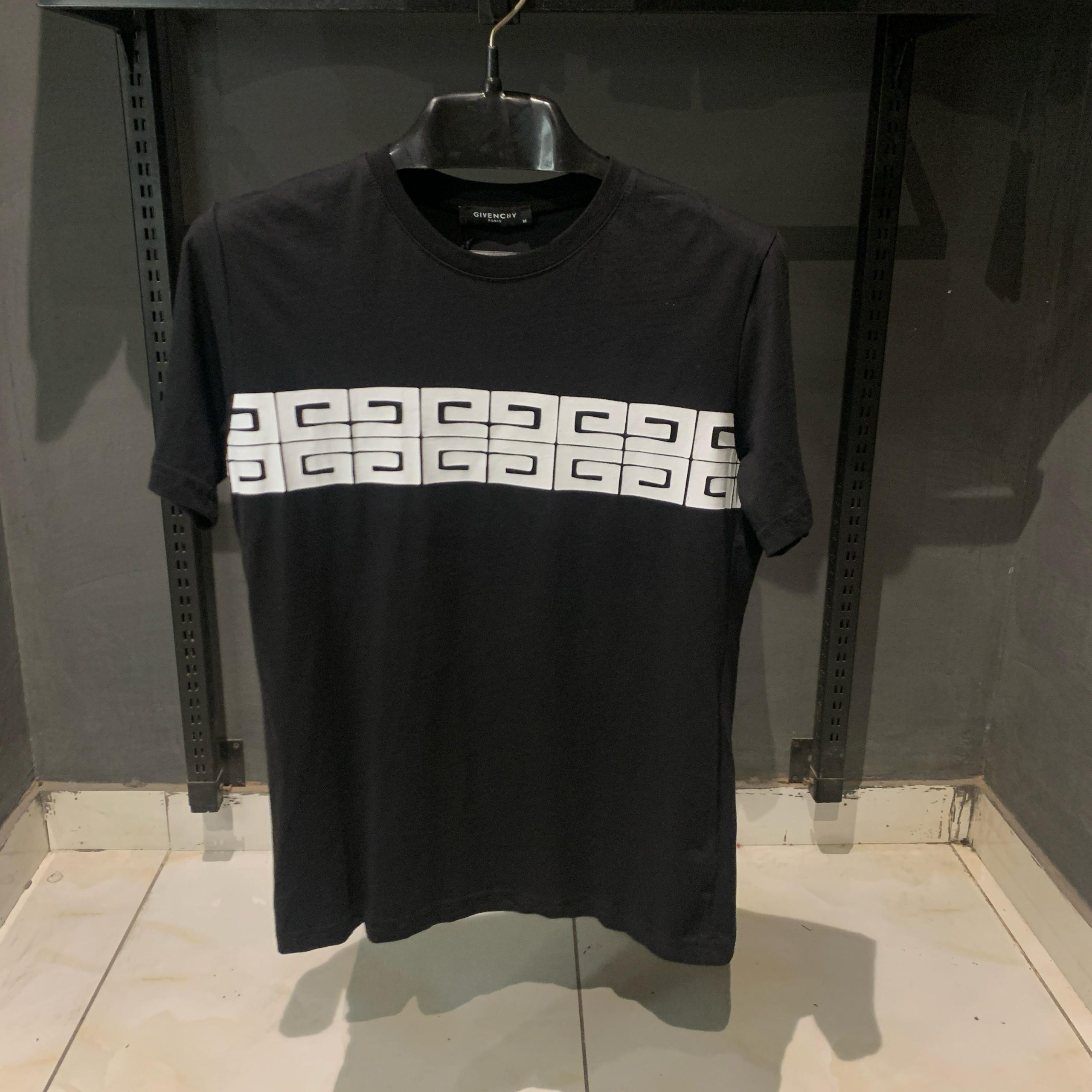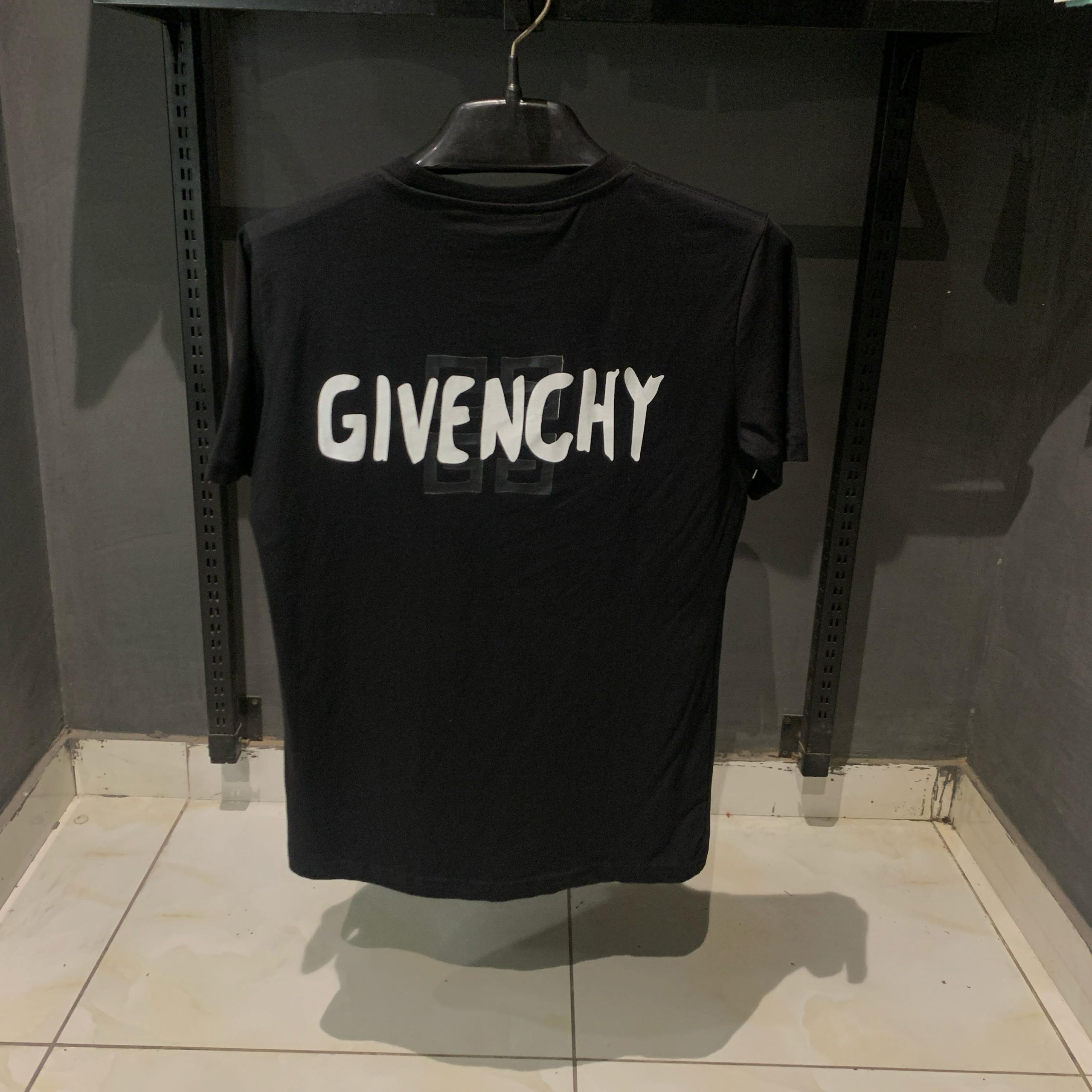 With its unique striped pattern and distinctive Givenchy logo on the back, this black T-shirt exudes luxury and contemporary flair. Perfect for those who appreciate high fashion with a touch of boldness, it’s a versatile addition to any wardrobe.