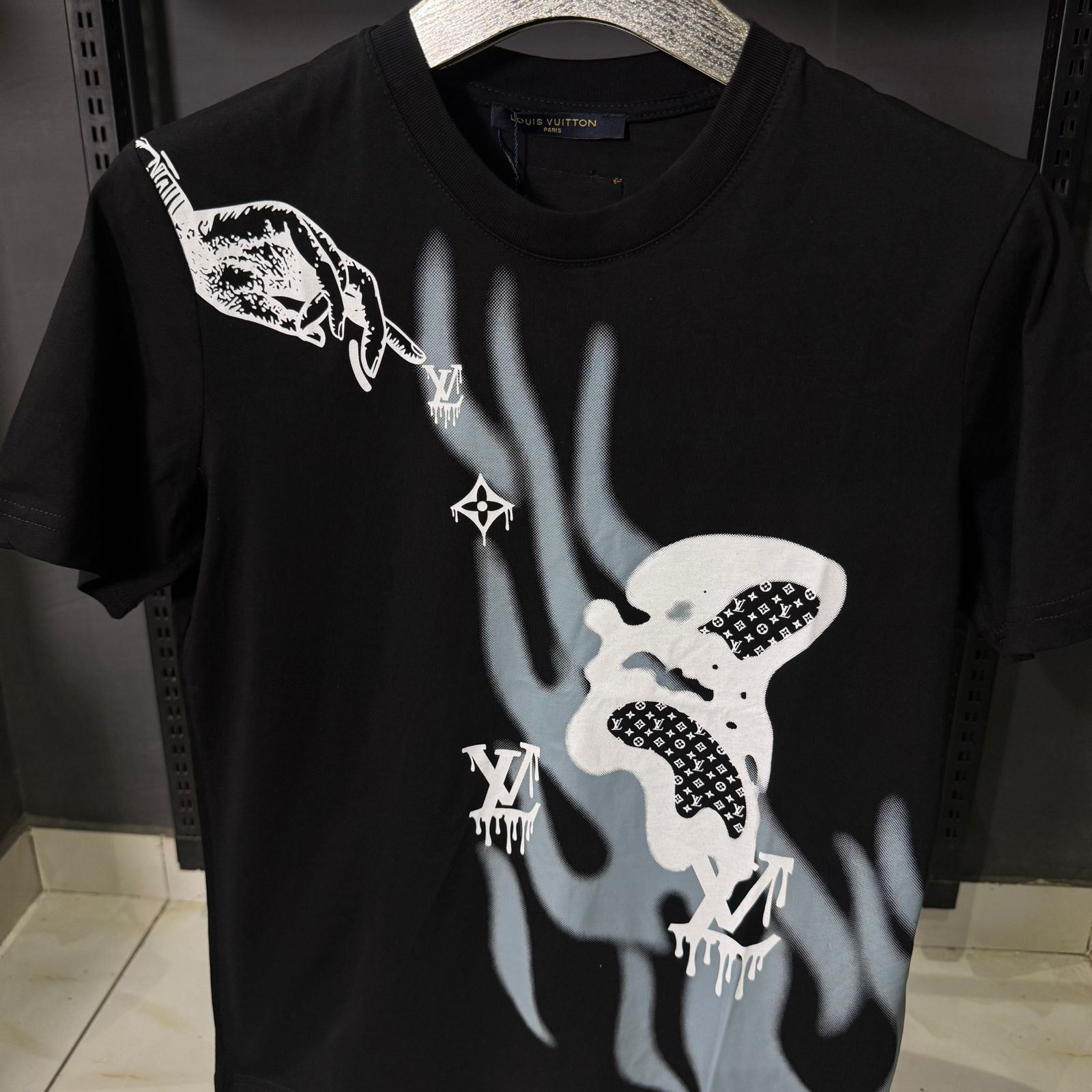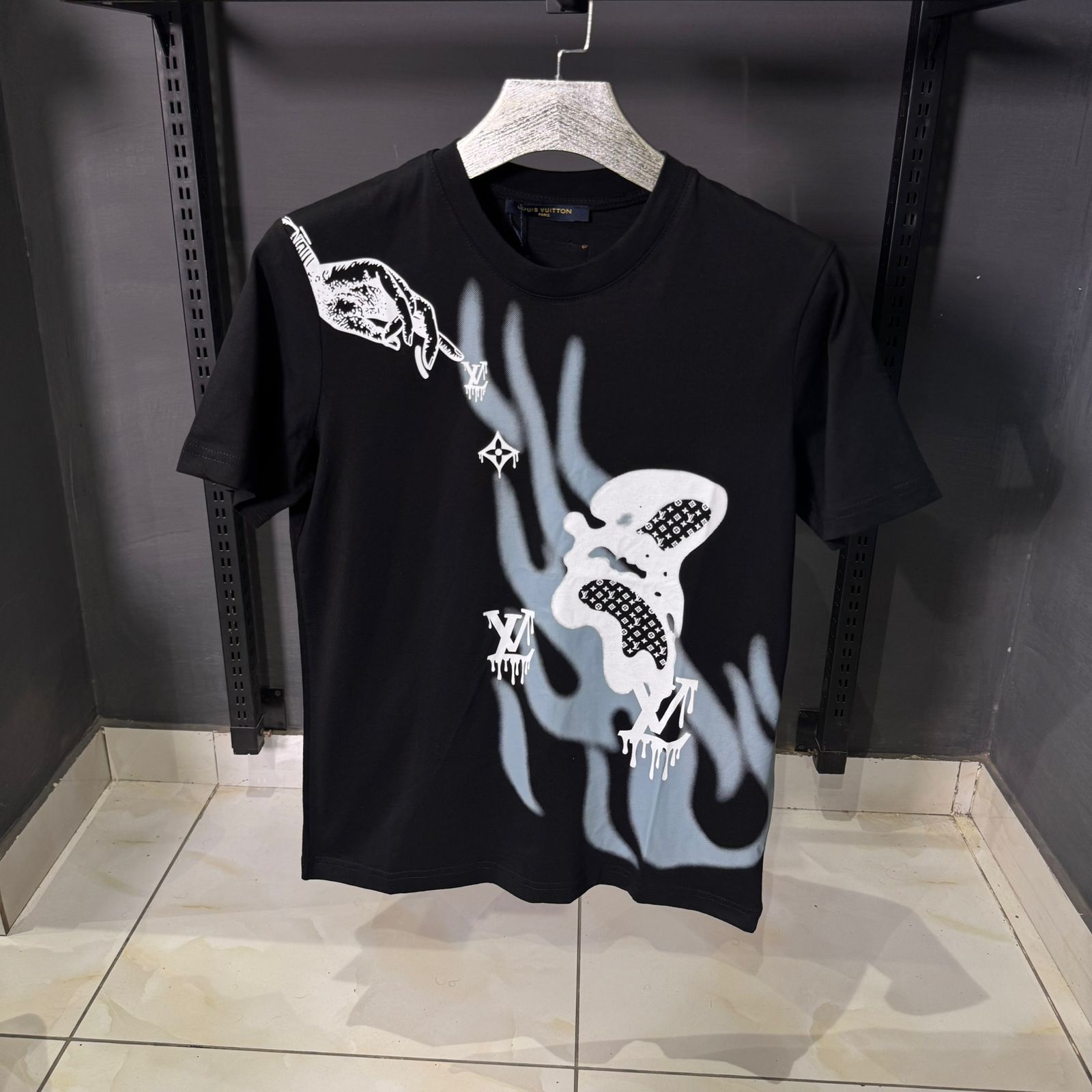 Turn up the heat with this Louis Vuitton Graphic Flame T-Shirt. Featuring a bold hand-drawn motif, smoke-like blue flames, and dripping LV monograms, this design merges street art with luxury fashion. Crafted on premium black cotton, it’s the perfect statement tee for those who dress to be noticed.