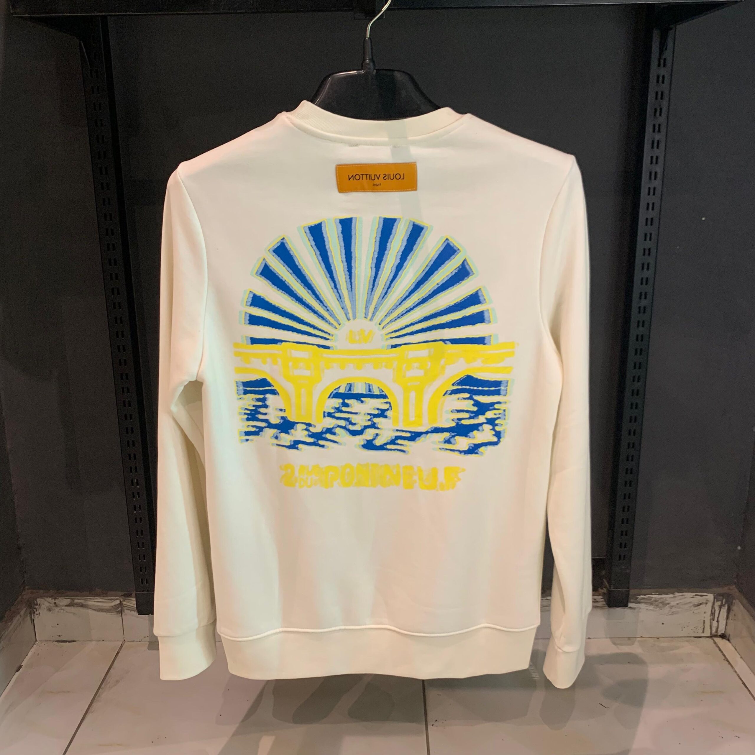 Elevate your wardrobe with the LV Intarsia Graphic Sweatshirt in off-white, showcasing intricate intarsia graphics. A perfect blend of elegance and casual luxury, this piece is designed for those who appreciate bold, refined fashion.