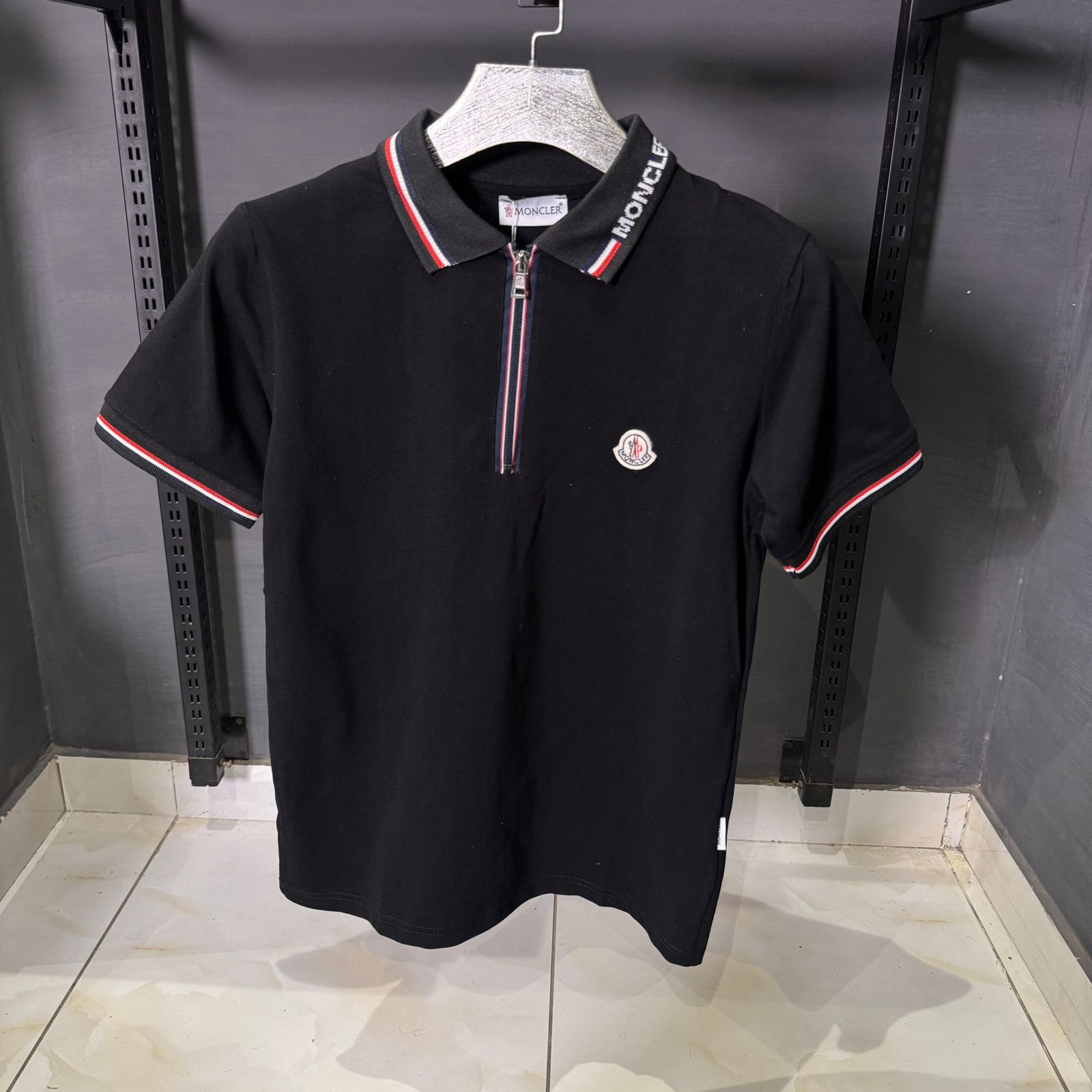Elevate your smart-casual wardrobe with this premium Moncler polo shirt, crafted in classic black with signature red, white, and blue tipping on the collar and sleeves. Featuring a sleek zip-up placket, embroidered Moncler chest badge, and branded collar detailing, this shirt delivers both luxury and edge.
