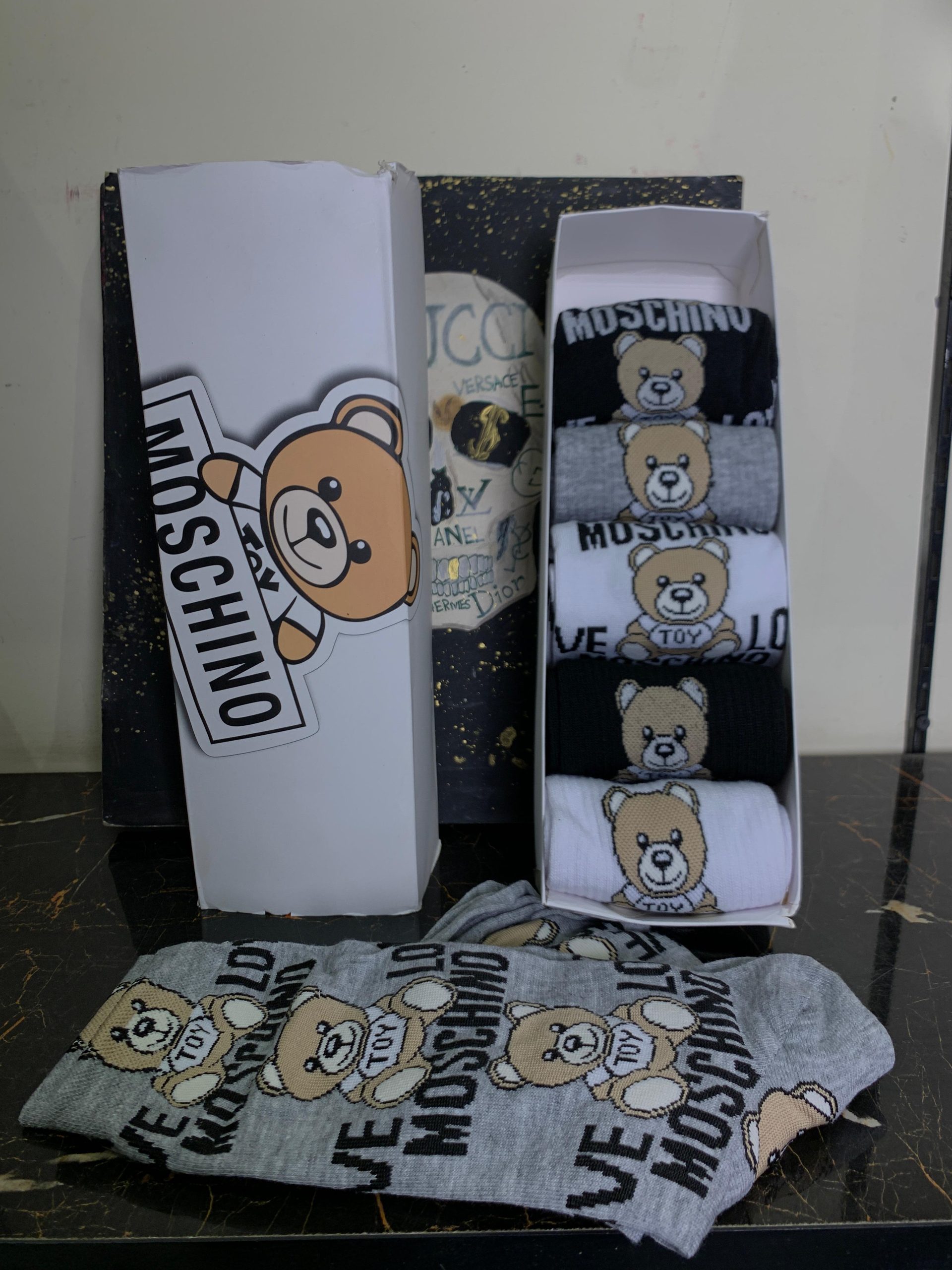 Add playful luxury to your wardrobe with this Moschino sock set, featuring the iconic Toy Bear and bold logo design. Made from a premium cotton blend for superior comfort, stretch, and durability. This 6-pair set includes assorted colors, all packed in a stylish Moschino gift box – perfect for fashion lovers.