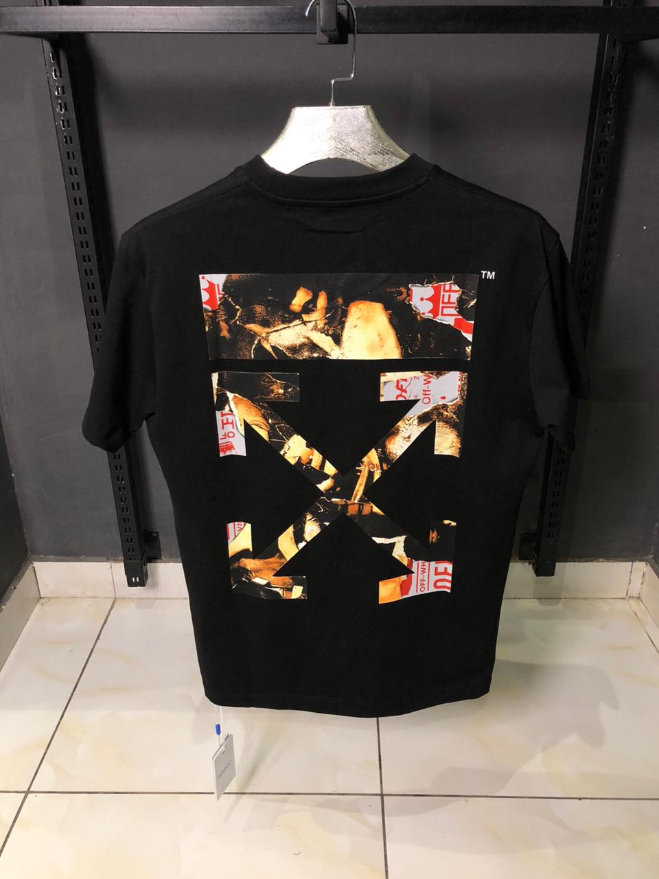 Command the streets with the Off-White Caravaggio Crown Arrows T-Shirt in Jet Black. This premium cotton jersey tee serves as a dark, sophisticated canvas for the brand’s signature artistic fusion. The front features a minimalist “Off-White™” logo centered over a small, curated excerpt from Caravaggio’s legendary works.