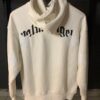 This off-white Palm Angels hoodie features a bold logo on the back shoulders and embossed star details on the sleeves. A perfect mix of high-end streetwear and comfort, making it an essential piece for a stylish, casual look.