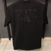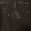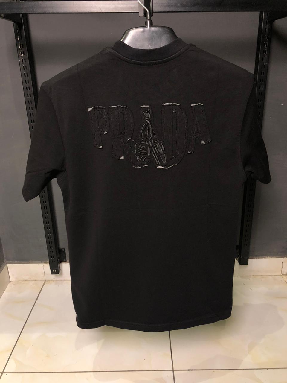 The back makes a bold statement with a large, distressed appliqué Prada logo, where the fabric is artfully frayed to create a “cut-out” effect that reveals a textured underlayer. Crafted from extra-fine Italian cotton jersey, this shirt offers a slim, tailored fit that feels exceptionally smooth against the skin. It’s an ideal choice for collectors who appreciate Prada’s ability to turn a classic silhouette into a conversation piece.
