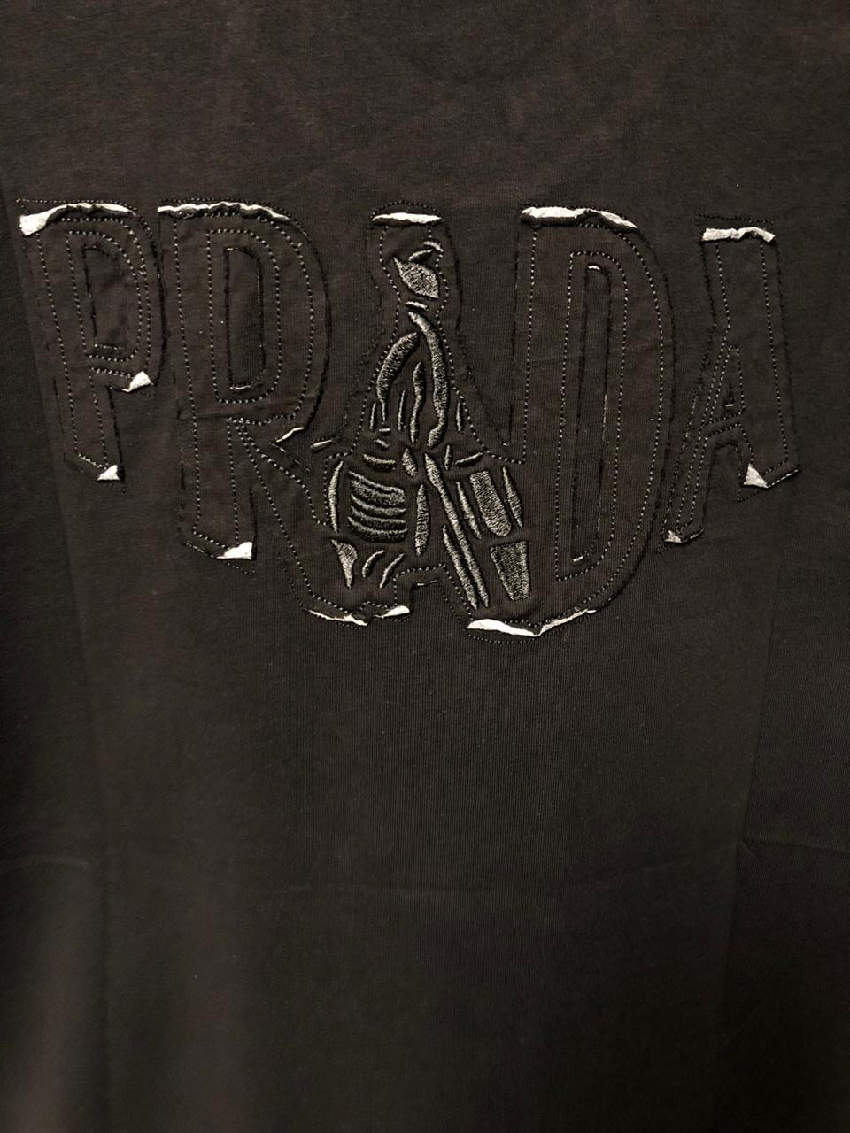 Back Detail: Oversized “PRADA” logo in a distressed, raw-edge patch style.