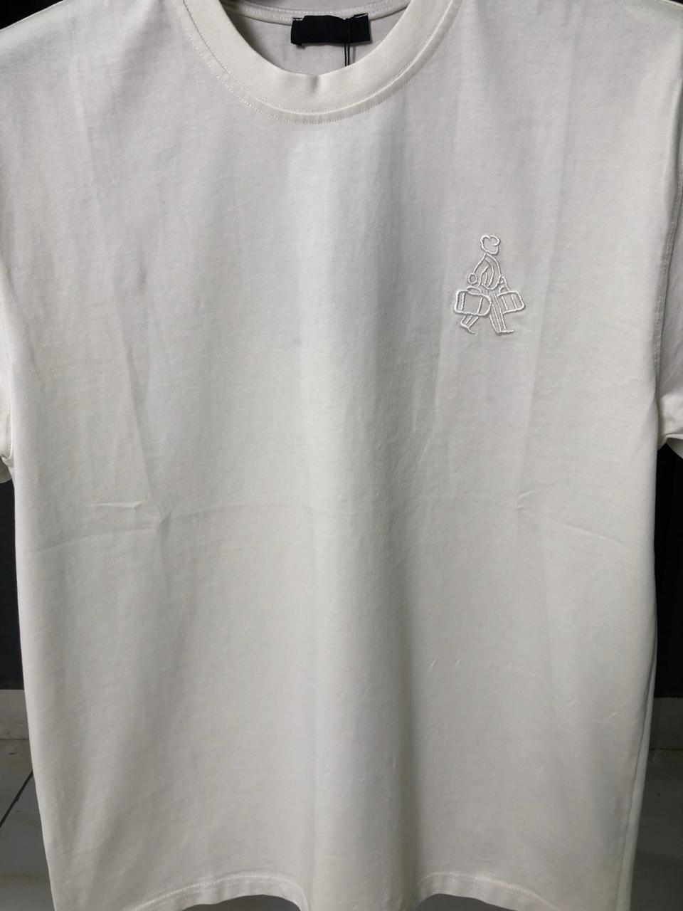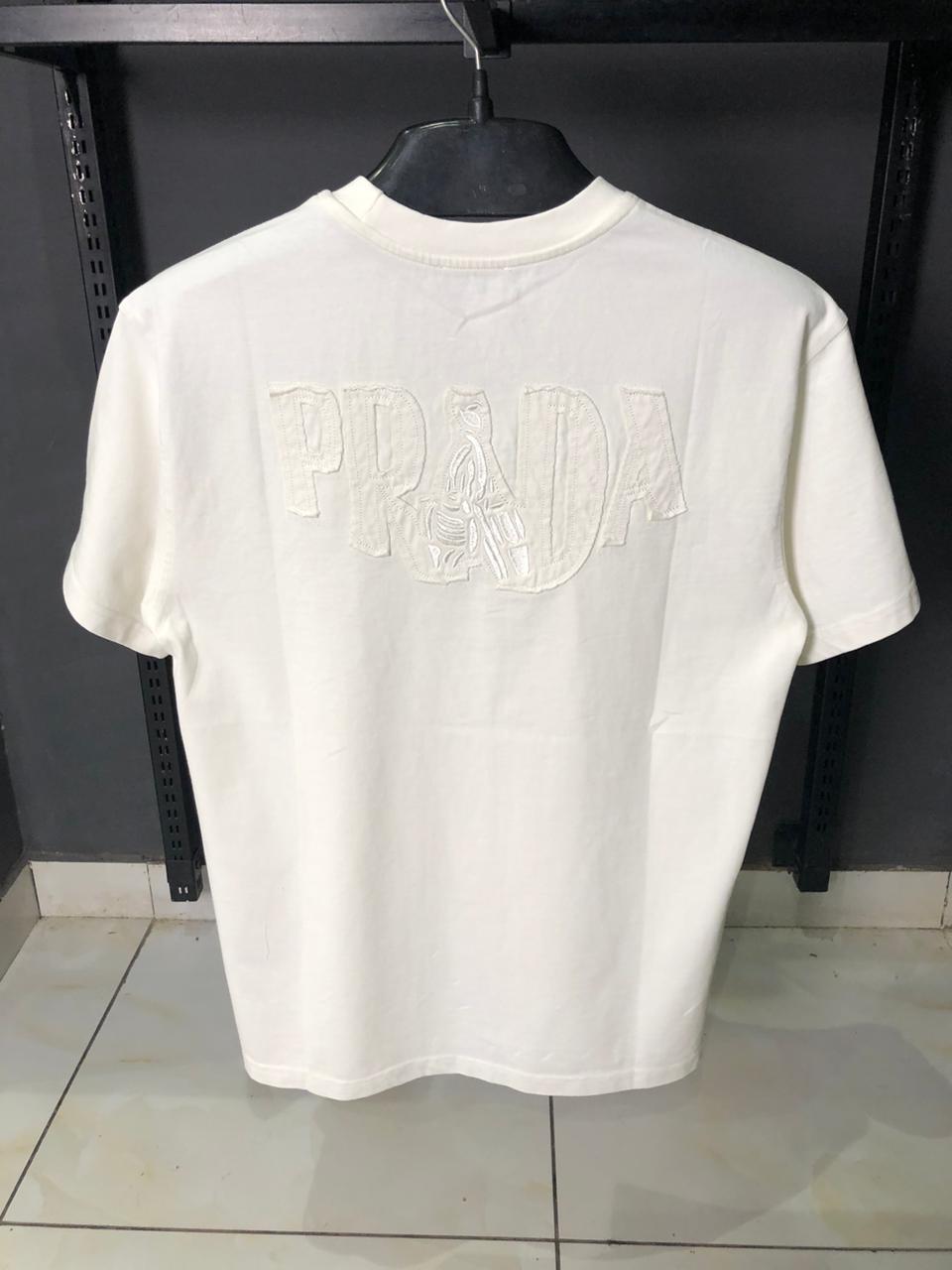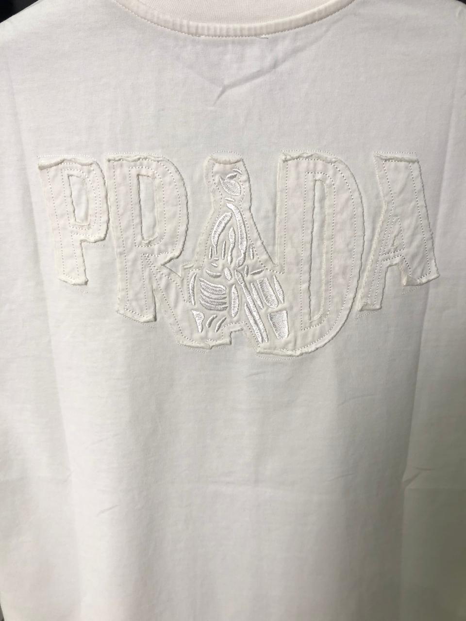 Elevate your high-end essentials with the Prada White “Porter” Graphic T-Shirt. This piece perfectly balances Prada’s sophisticated heritage with a modern, rebellious edge. The front features a charming, tonal embroidered porter figure on the chest, while the back commands attention with an oversized, distressed appliqué Prada logo. The artfully frayed edges of the back logo create a raw, deconstructed look that contrasts beautifully against the crisp white fabric.
