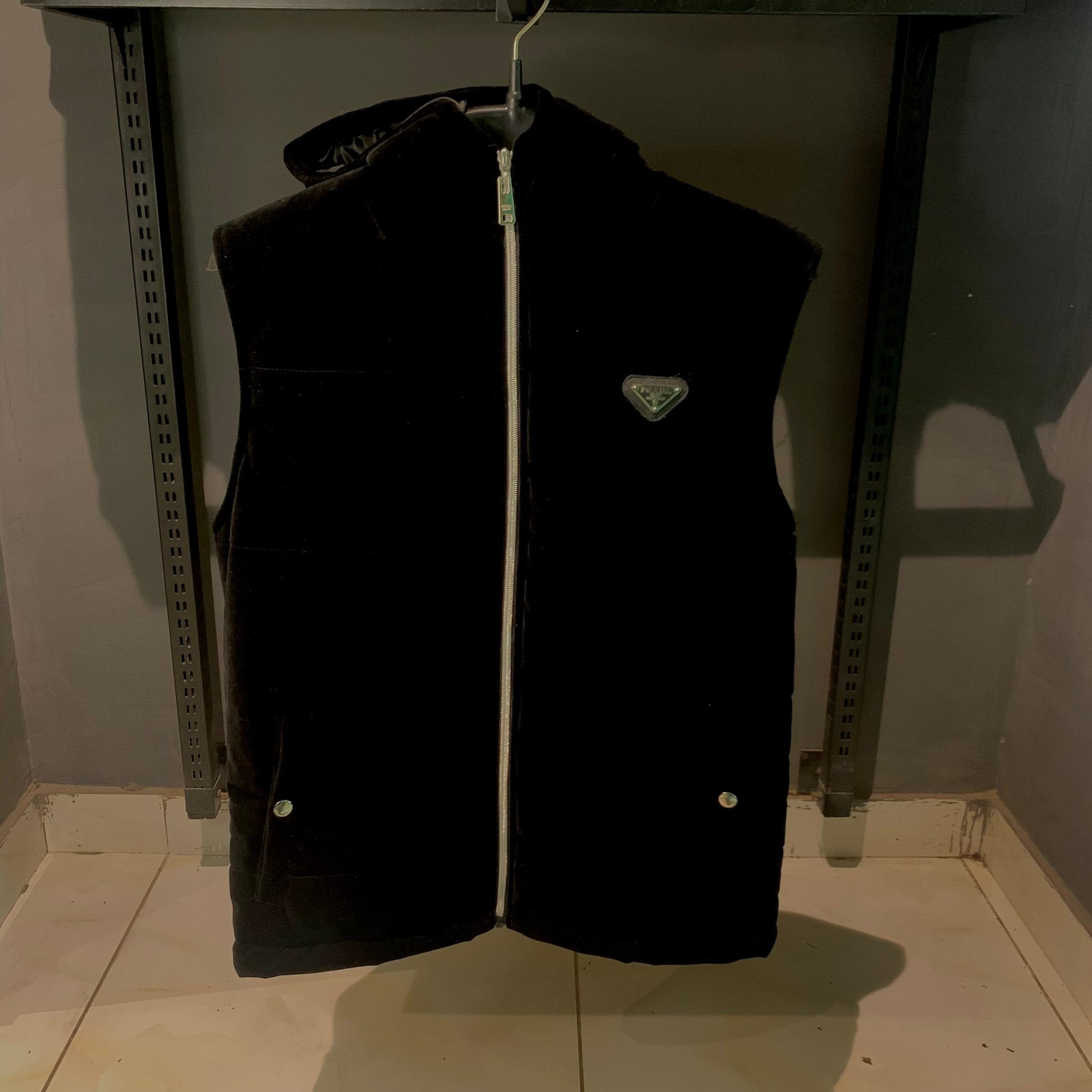 Featuring a blend of velvet and technical fabric, this Prada vest combines warmth and elegance with its unique half-sleeve cut and signature hood for a modern, functional look.