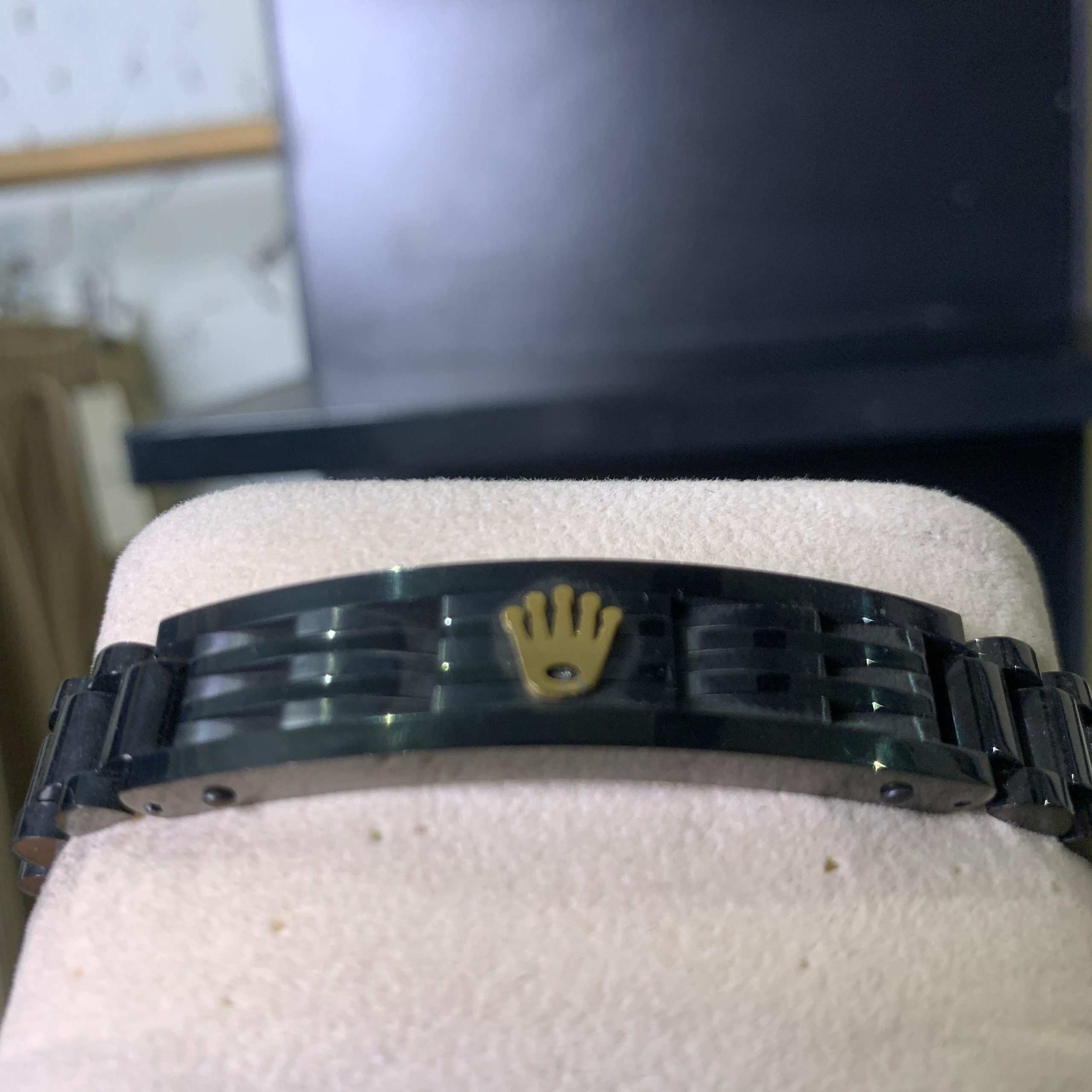 This stylish bracelet features a black stainless steel band with a striking gold crown emblem, inspired by Rolex’s iconic design. A bold blend of luxury and modern edge.