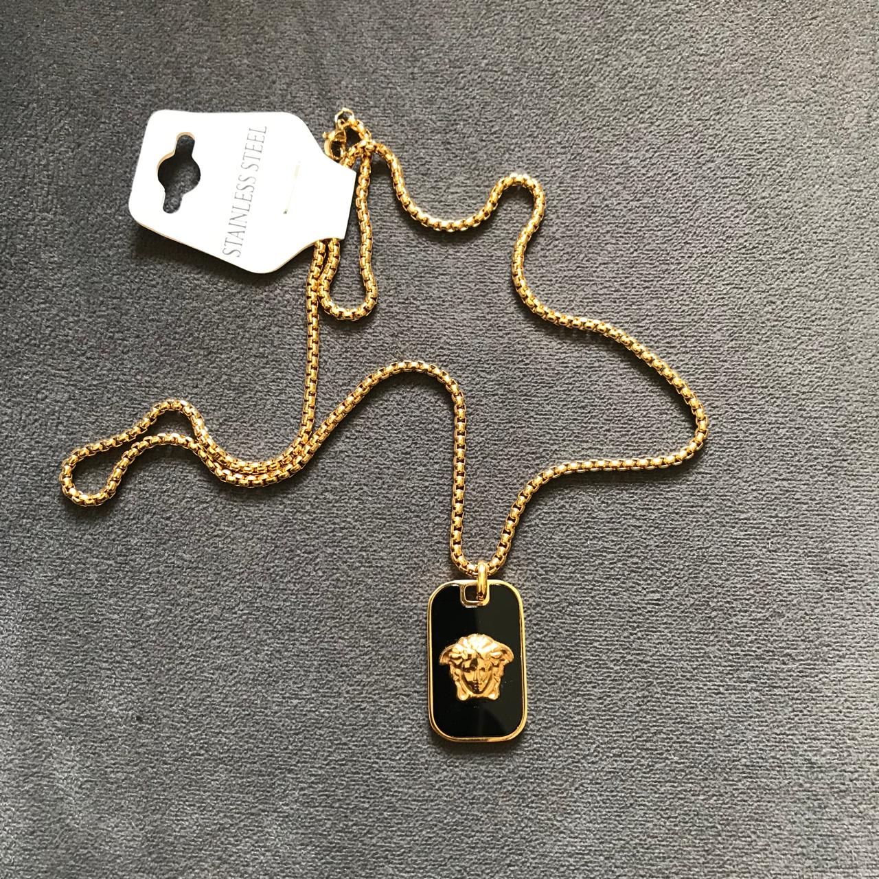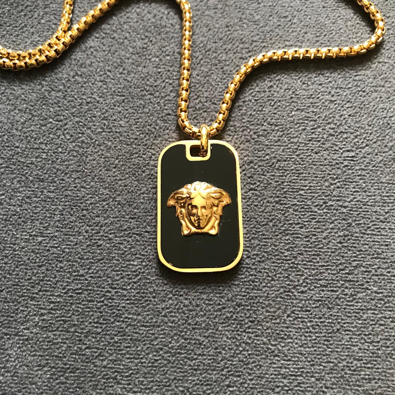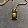 Versace Black Enamel Double Tag Gold Tone Chain Link Long Necklace