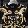 Step into luxury with this Versace Jeans Couture T-Shirt, showcasing an iconic gold baroque pattern on a bold black backdrop. The eye-catching print and statement “Versace Jeans Couture” branding across the chest make this a standout piece perfect for high-impact streetwear or upscale casual looks.